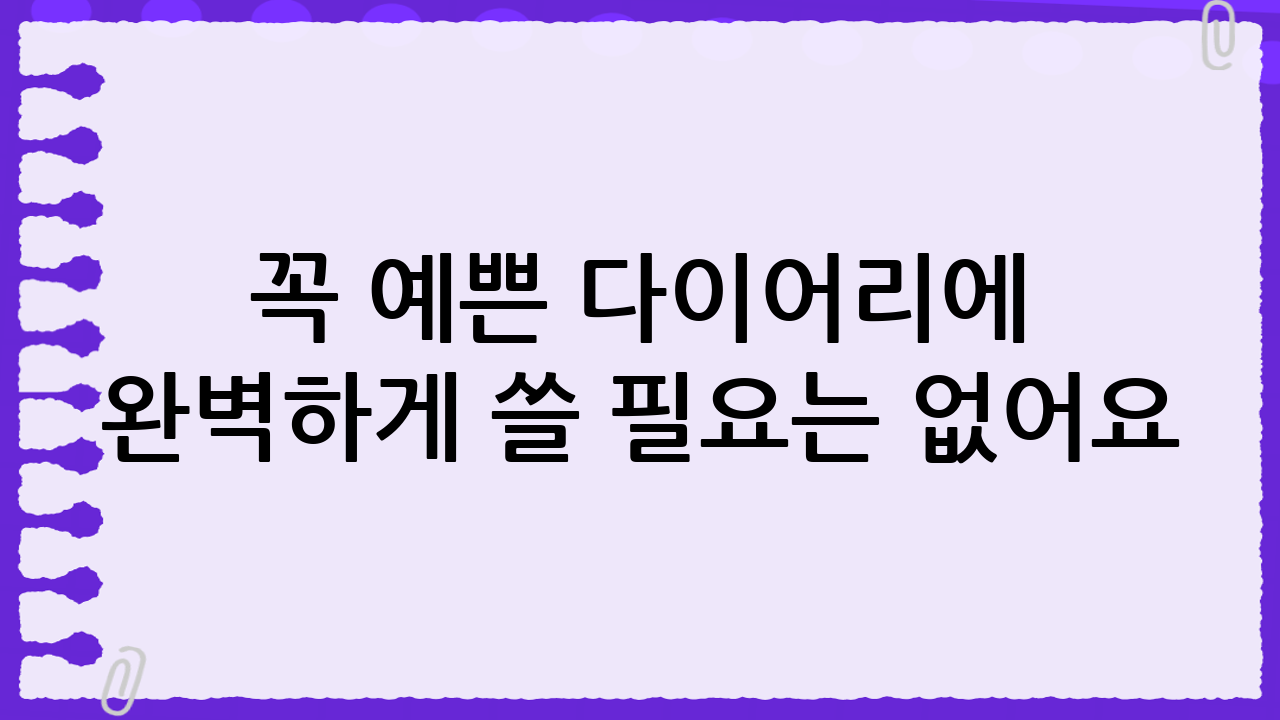 '다이어리'라고 하면 예쁜 스티커와 펜으로 꾸며야 한다는 압박감을 느끼는 분들이 많습니다. 하지만 가장 중요한 것은 '꾸준함'이지 '완벽함'이 아닙니다. 매일 쓰는 것이 부담스럽다면 일주일에 2~3번도 좋습니다. 나에게 맞는 편안한 방법을 찾아보세요.
