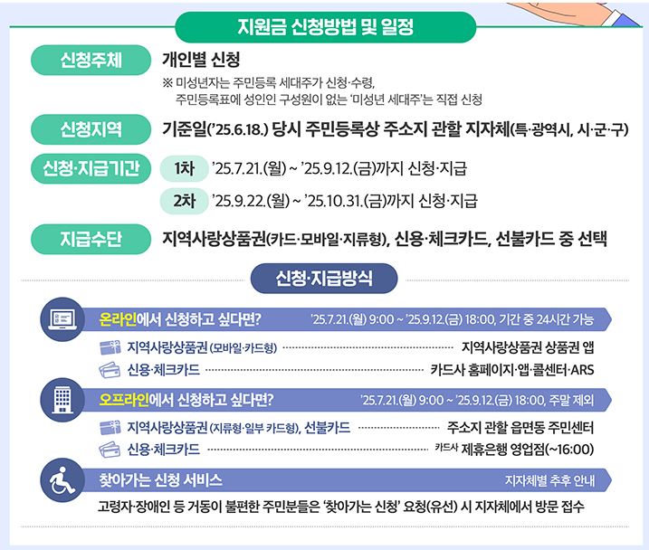 1차 지급은 2025년 7월부터 시작되었고, 신용·체크카드, 선불카드, 지역사랑상품권 형태로 사용할 수 있습니다.